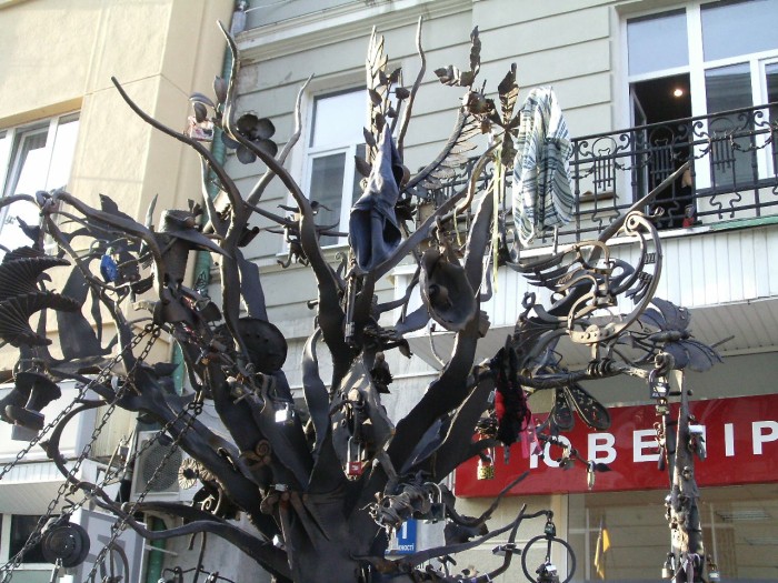 Металеве "Дерево щастя", споруджене на пішохідній зоні головної вулиці обласного центру — Незалежності в честь щорічного "Свята ковалів", “прикрашають” китайськими колодками, стрічками, а подекуди і нижньою білизною. Одну із найцікавіших прикрас міста франківці обвішують непотребом. На апаратній нараді міськвиконкому представники служби оперативного реагування заявили, що цьому питанню потрібно надати належну увагу, а "Дереву щастя" — попередній вигляд.